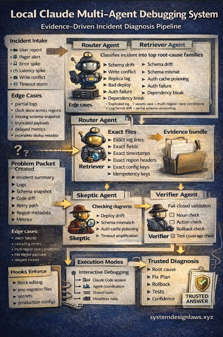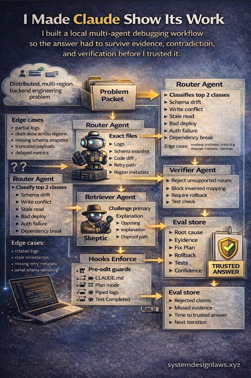 The system split debugging into 4 jobs. The router classifies the failure first such as schema drift, write conflict, stale read, bad deploy or auth failure. The retriever pulls exact logs, fields, timestamps, files and configuration. The skeptic attacks the first explanation and forces a different root-cause family. The verifier rejects any answer mentioning tables, regions, fields or APIs that never appeared in the evidence. The goal was not parallel agents doing the same work; the gain comes from strict role separation.
